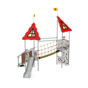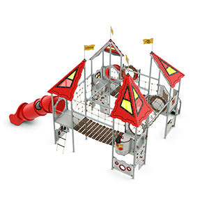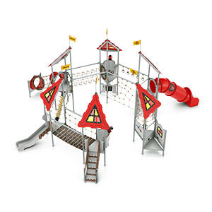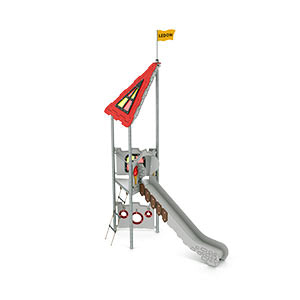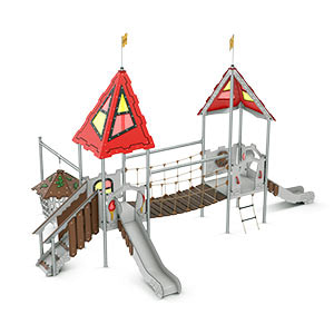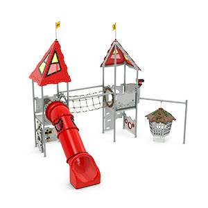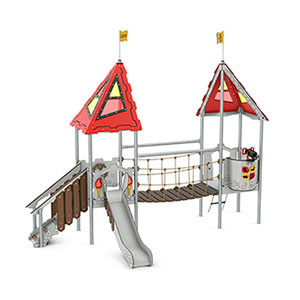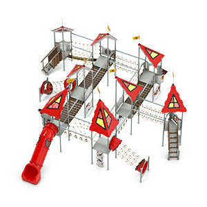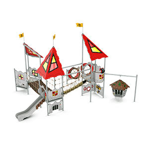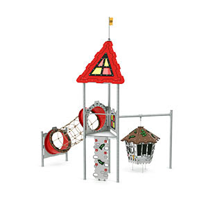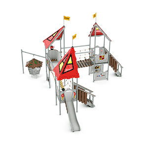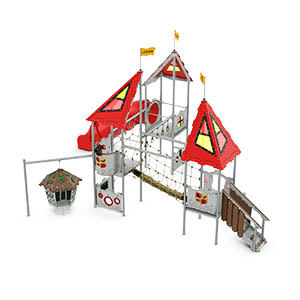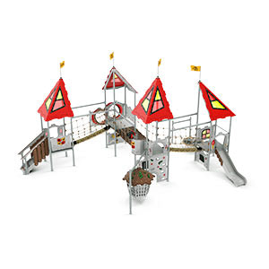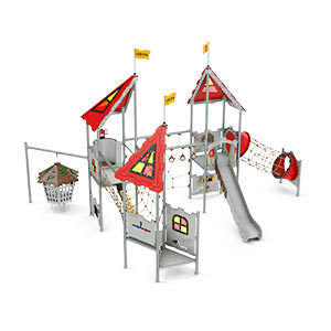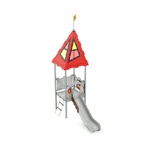 Die innovativen Details der Produktreihe verleihen dem Spielplatz zusätzlichen Spielwert. Beispielsweise haben die Dächer gelbe und rote Fenster, die farbige Flecken auf den Boden zaubern. Diese können die Kinder gut in ihre Spiele – zum Beispiel „Der Boden ist Lava“ – einbeziehen.