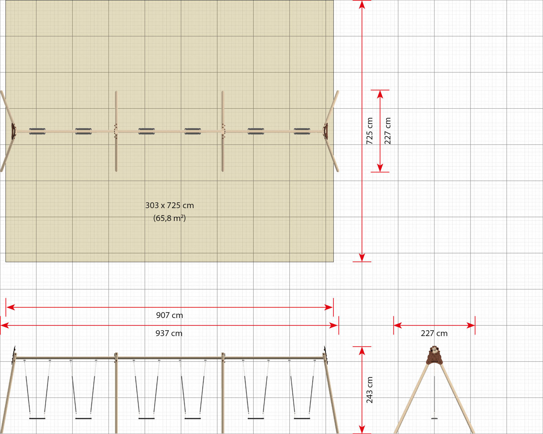Dank eines modularen Schaukelgestells können mehrere Kinder gleichzeitig schaukeln. Darüber hinaus ist das Schaukelgestell in mehreren unterschiedlichen Kombinationen erhältlich, die an spezifische Altersgruppen angepasst werden oder eine breite Altersgruppe abdecken können, je nachdem, welcher Sitz gewählt wird.