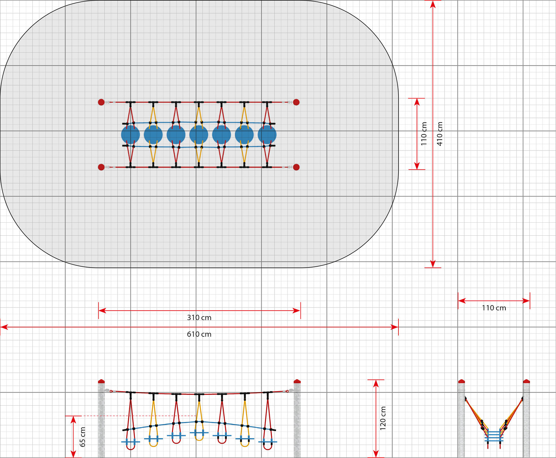 Die Wackelbrücke ist aus langlebigen und wartungsarmen Materialien hergestellt mit feuerverzinkten Pfosten und Taifun-Tauwerk, das vor Vandalismus geschützt ist.