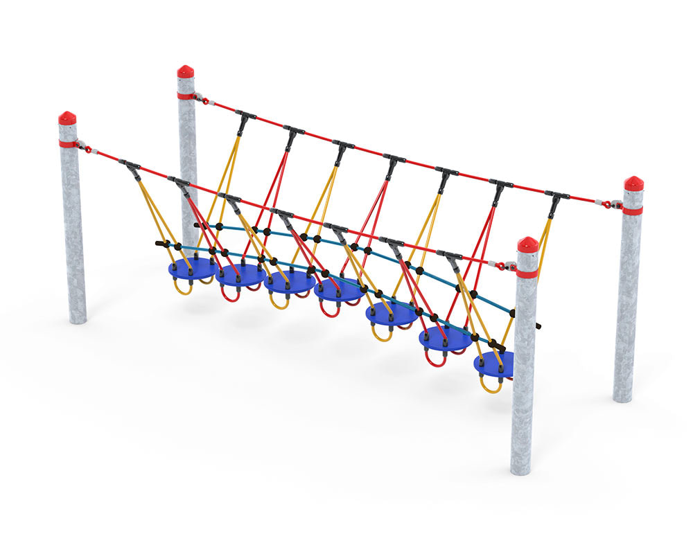 Die Wackelbrücke fordert den Gleichgewichtssinn der Kinder heraus und kann entweder allein stehen oder Teil einer Reihe weiterer Balanciergeräte sein. Sie hat runde Scheiben, auf die man tritt und die an einem Taifun-Taufwerk aufgehängt sind. Daher sind sie ständig in Bewegung. Das Überqueren der Brücke macht Kindern Spaß und fordert sie gleichzeitig.
