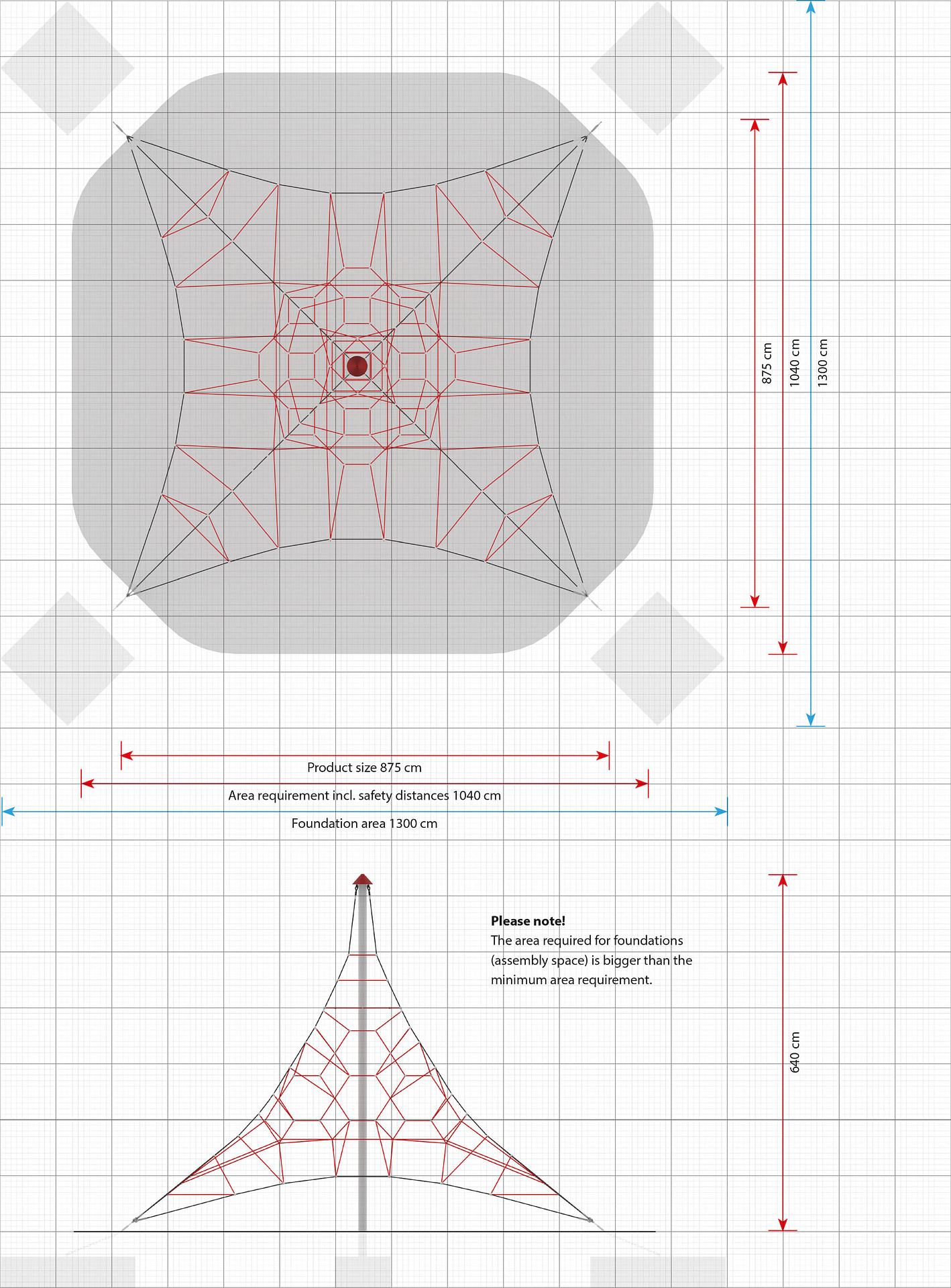 Hinweis: Die Fundamentfläche ist größer als der Flächenbedarf inkl. Sicherheitsabstände.