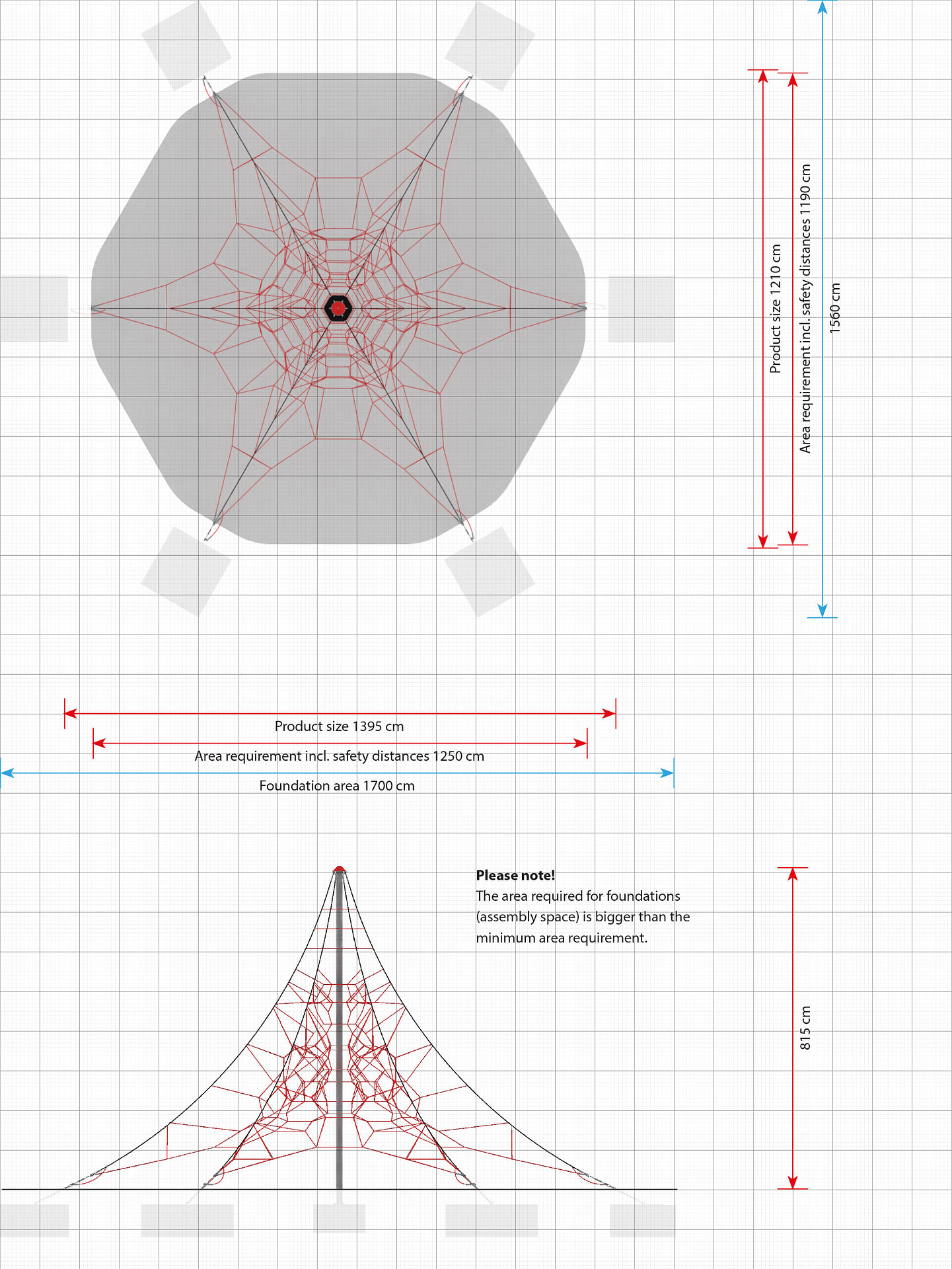 Hinweis: Die Fundamentfläche ist größer als der Flächenbedarf inkl. Sicherheitsabstände.