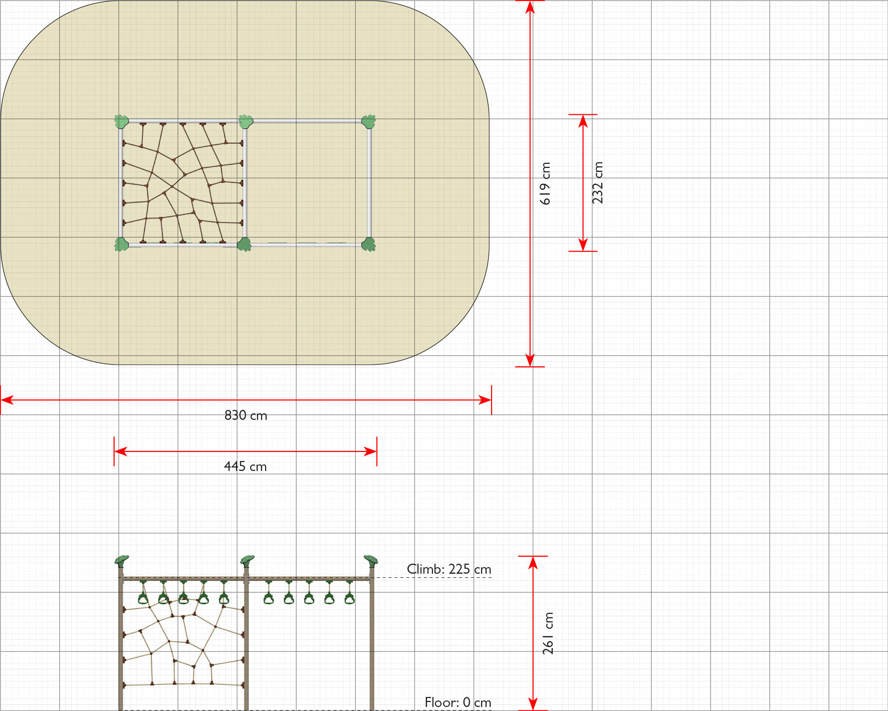All unsere Kletternetze bestehen aus Taifun-Tauwerk, das einen festen Kern aus insgesamt 48 Stahldrähten hat. In der Praxis bedeutet dies eine Zugfestigkeit von 4500 kg. Daher sind unsere Kletternetze extrem widerstandsfähig gegenüber Vandalismus und gewährleisten zudem eine stabile Konstruktion.