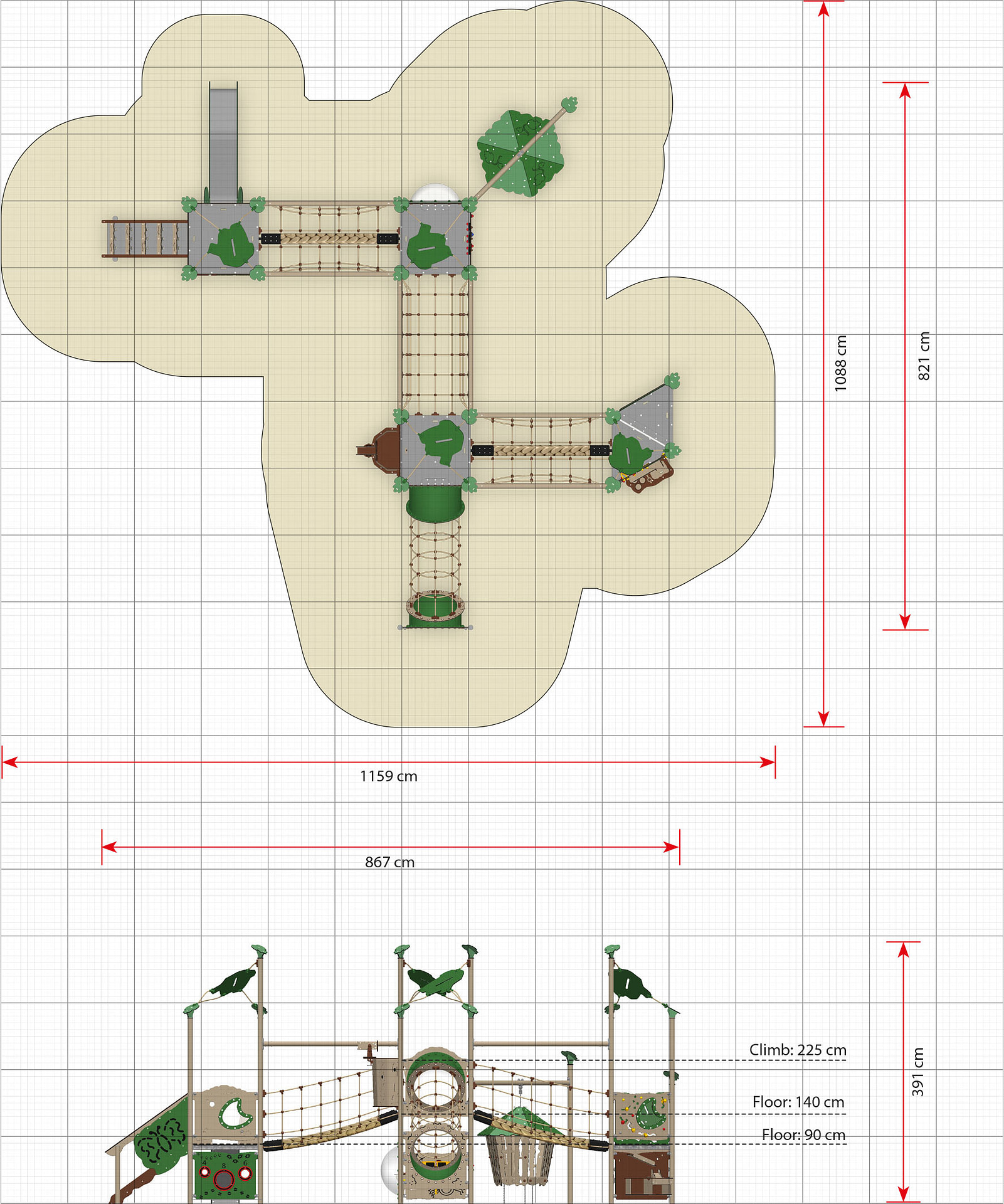Titan ist eine der großartigsten Spielanlagen der Explore-Welt. Die Anlage ist in verschiedene Bereiche eingeteilt, sodass mehrere Spielaktivitäten gleichzeitig ablaufen und damit mehrere Altersgruppen parallel spielen können, ohne einander zu stören. Titan bietet Spielelemente, die sämtliche Aspekte der kindlichen Entwicklung ansprechen – kognitive, soziale, emotionale, motorische und nicht zuletzt körperliche. Die Spielanlage Titan enthält zum Beispiel mehrere Hängebrücken, ein Helikopter-Cockpit mit Kuppelfenster, einen Netztunnel, eine Rutsche, zahllose Spielwände und einen speziellen Spielbereich für Kleinkinder. Weitere Informationen hierzu finden Sie unten.
