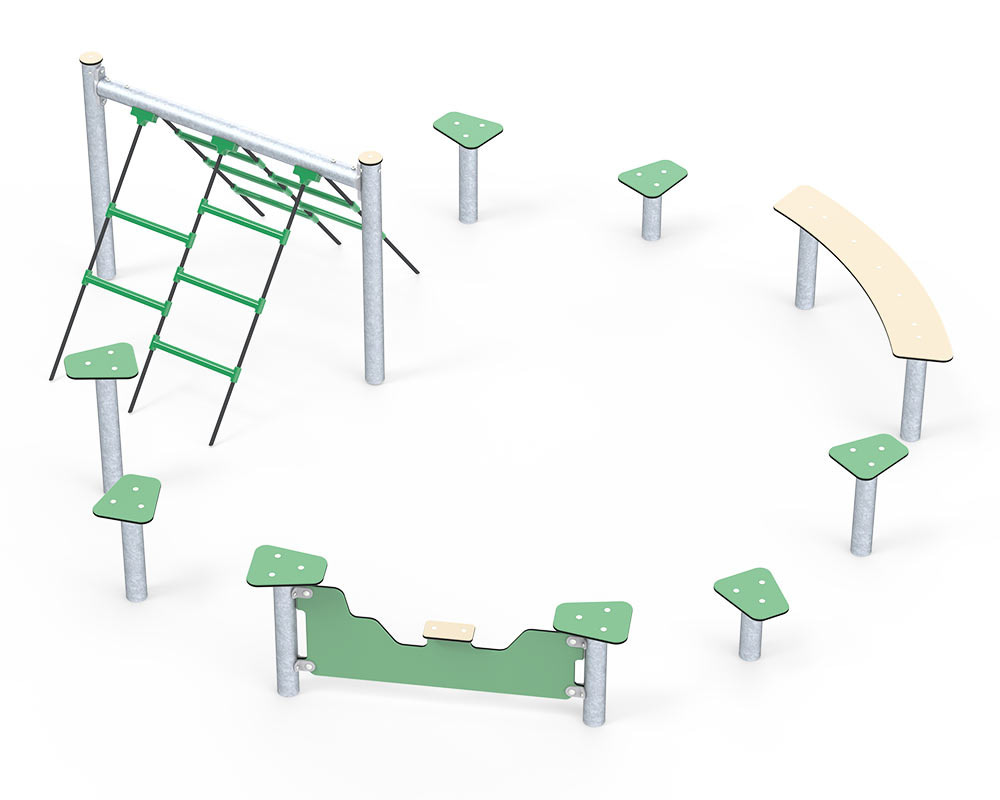 Unser Hindernisparcours in O-Form zeigt Ihnen eine Auswahl unserer Balanciergeräte. Die Kreisform eignet sich perfekt zum Fangenspielen.