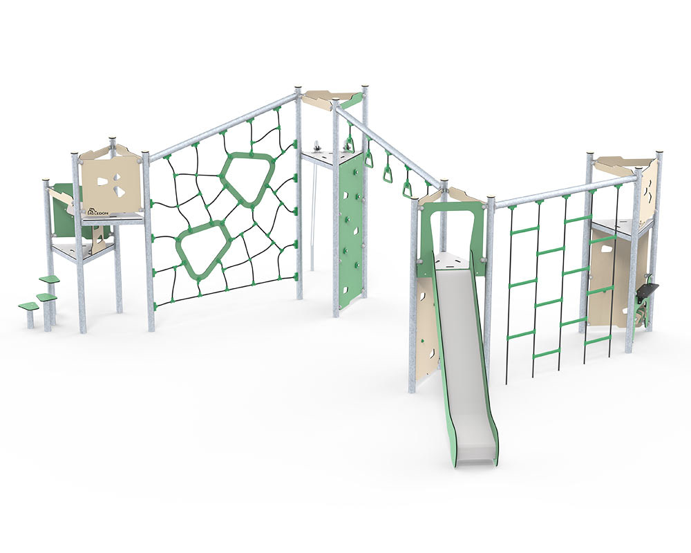 Die vielen Spieltürme der Spielanlage Brandon sind über zwei Kletternetze und eine Hangelstrecke miteinander verbunden. Außerdem gibt es drei Kletterwände, Trittsteine, mehrere Ebenen und eine Spielwand für die Kleinsten. All diese Aktivitäten fördern die natürliche Entwicklung von Kindern. Beim Klettern wird die Grobmotorik gefördert und beim Spielen an der Spielwand auch die Feinmotorik.