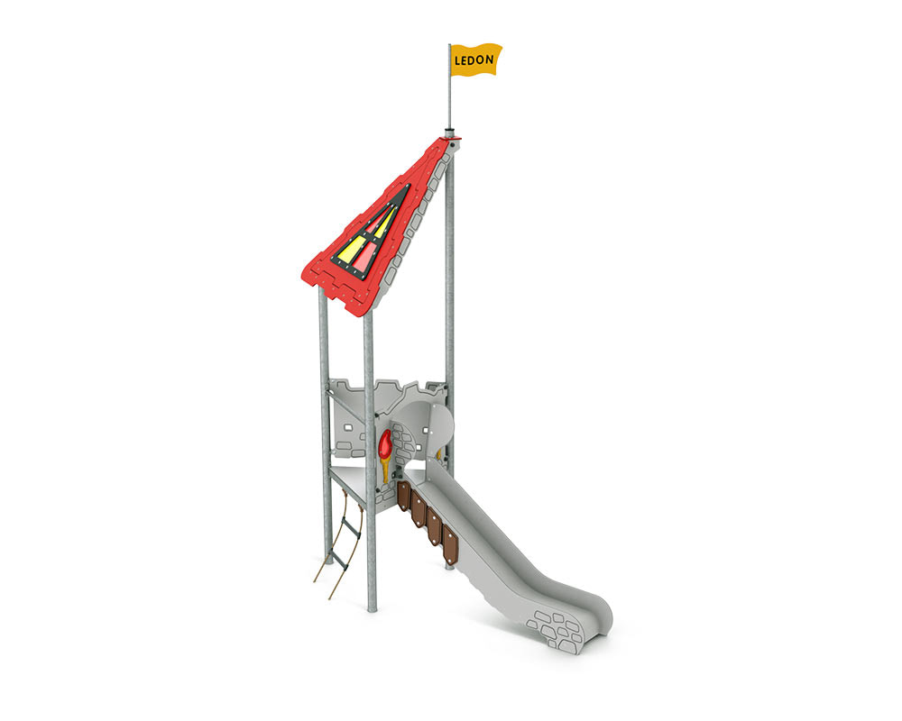 Unsere Castle-Serie bietet Spielgeräte für jeden Bedarf. Lancelot ist unser Grundmodell, das Spaß bringen, aber auch fordern soll. Die kurze Strickleiter reicht bis zum Turm, der eine Bodenhöhe von 90 cm aufweist und von dem aus man die Rutsche hinabsausen kann. Die durchsichtigen Dachfenster erzeugen bunte Muster auf dem Boden sowie in der unmittelbaren Umgebung und regen damit zu Spielen wie „Der Boden ist Lava“, „Himmel und Hölle“ oder sogar zum Tanzen an.