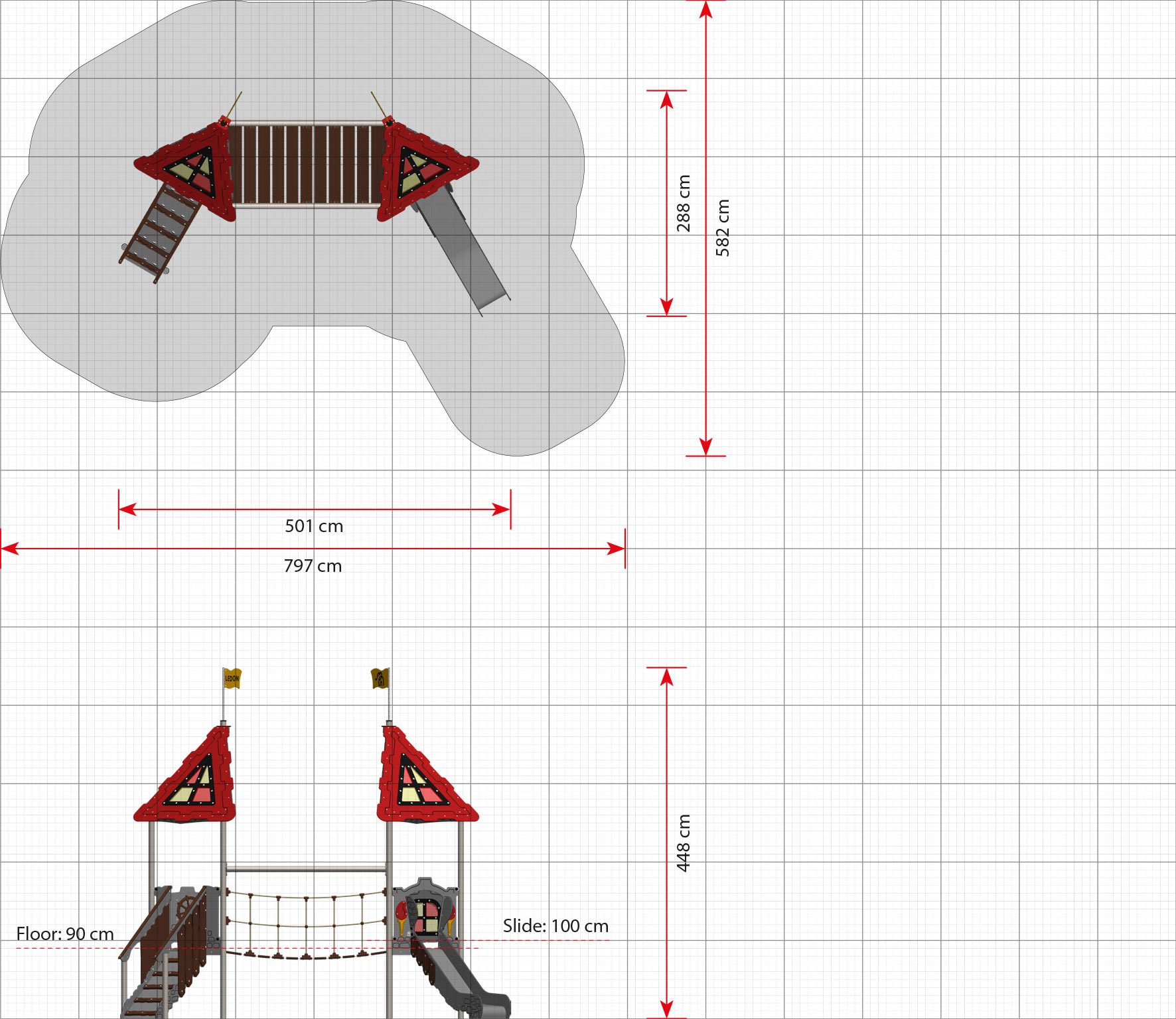 Der erste Turm ist mit einem drehbaren Steuerrad ausgestattet, das zu stundenlangem Spielen auf einem imaginären Ozean inspiriert. Wird das Steuerrad gedreht, rotiert auch das Schwert am Ritterschild auf der anderen Seite. Auf der schwingenden Hängebrücke, die zum nächsten Turm führt, können die Kinder „seefest“ werden. Im zweiten Turm angekommen, können sie durch ein buntes Fenster blicken und eine Rutsche hinabsausen, um wieder festen Boden unter die Füße zu bekommen. Beide Türme enthalten selbstverständlich die markanten bunten Dachfenster der LEDON Castle-Serie, die Muster auf den Boden projizieren und die Fantasie der Kinder anregen.