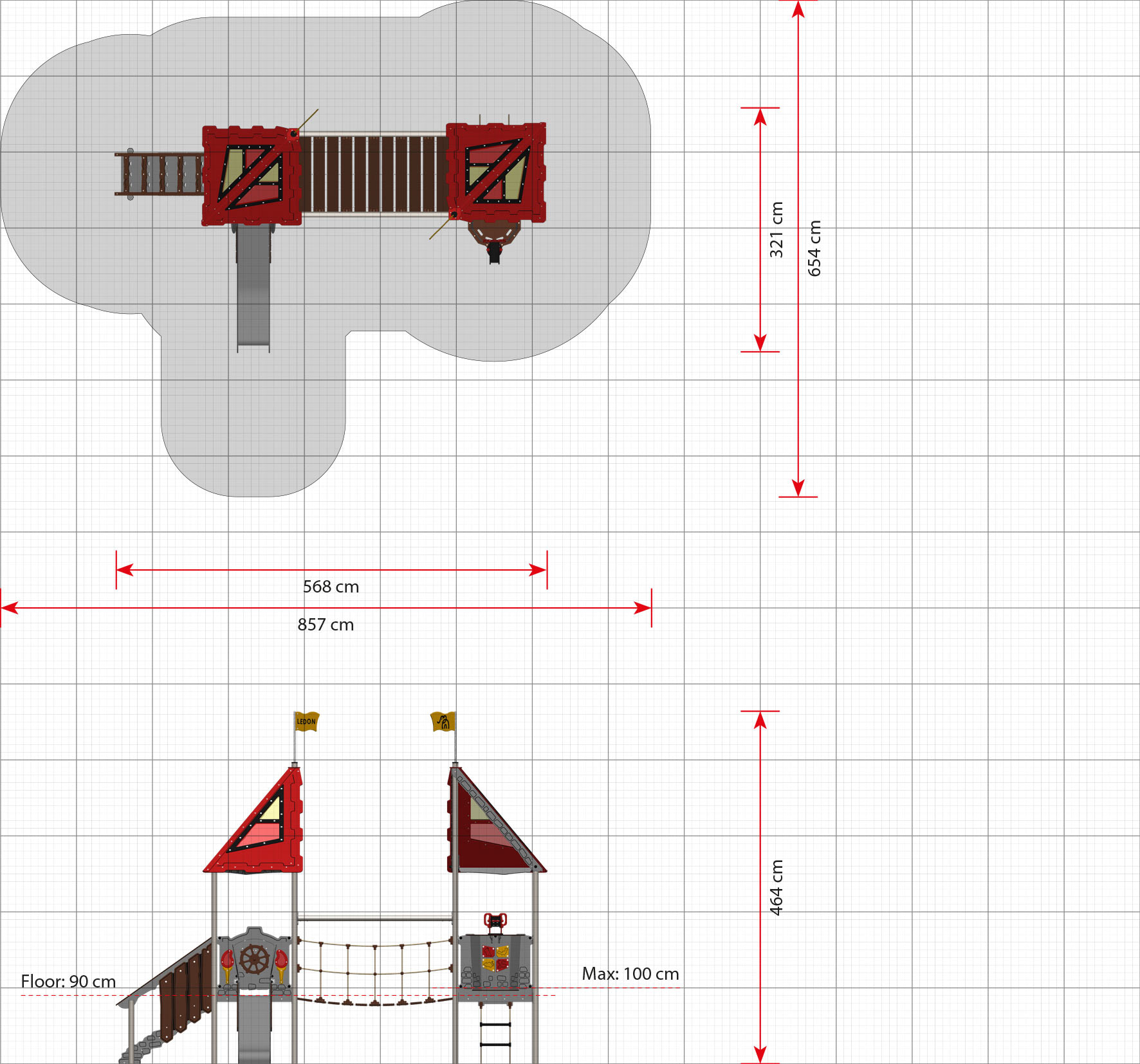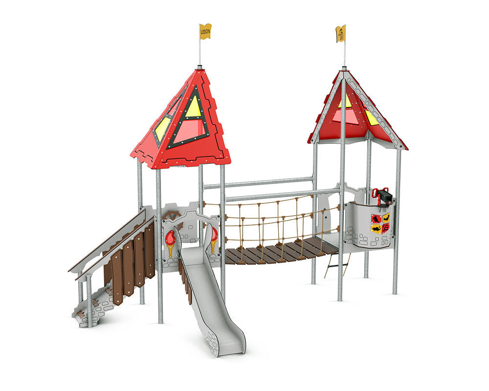 Lionel ist ein Spielplatz mit zwei Spieltürmen. Die großen quadratischen Plattformen bieten verschiedene Spielaktivitäten und ausreichend Platz für mehrere Kinder. Größere Kinder gelangen über die Strickleiter nach oben, während die Kleinsten einfach die rutschfesten Stufen nutzen können.