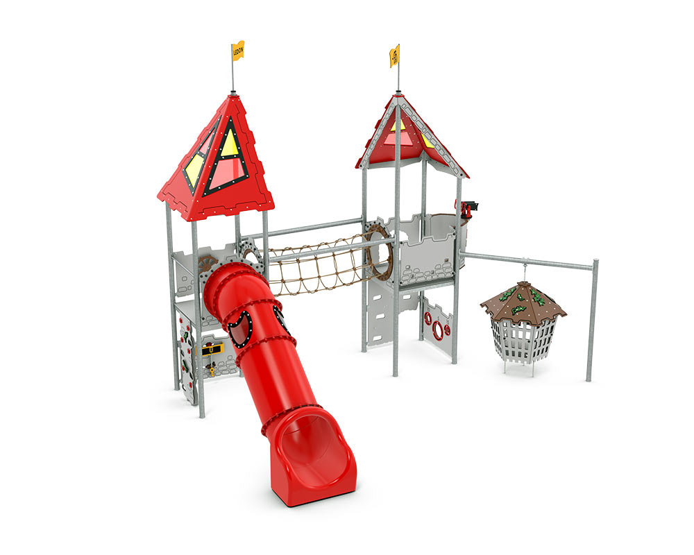 Troy enthält auch eine der beliebten Röhrenrutschen von LEDON. Die Rutsche zaubert ein Lächeln auf kleine Gesichter und hilft Kindern ganz nebenbei, Entfernungen und Geschwindigkeiten einschätzen zu lernen. Die Fenster im Tunnel sorgen für ausreichend Licht. Troys Bodenhöhe liegt bei 140 cm und garantiert rasante Rutschpartien.