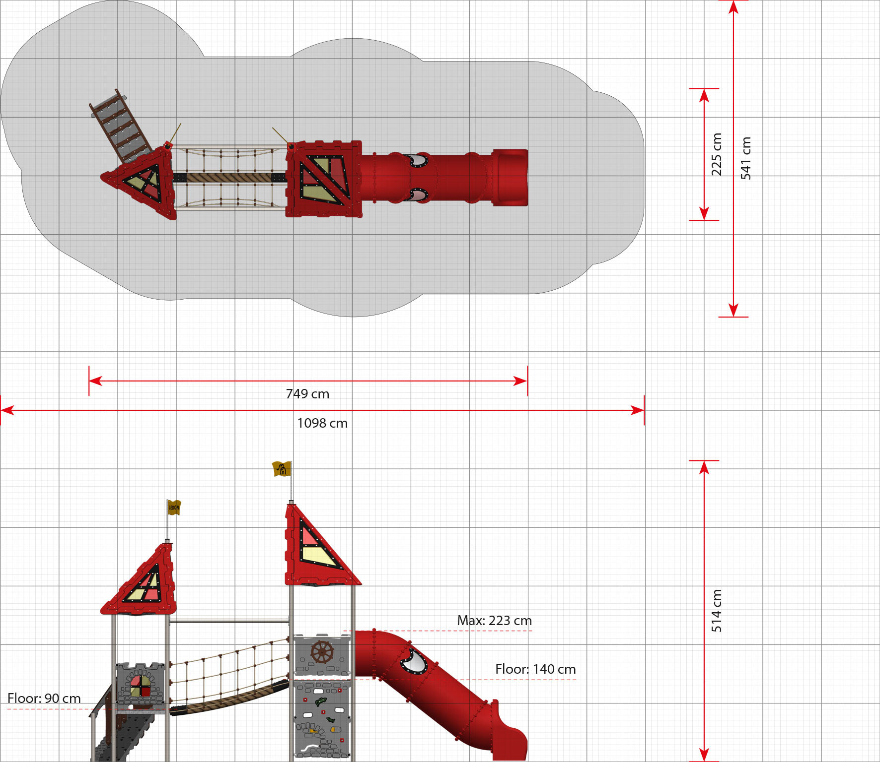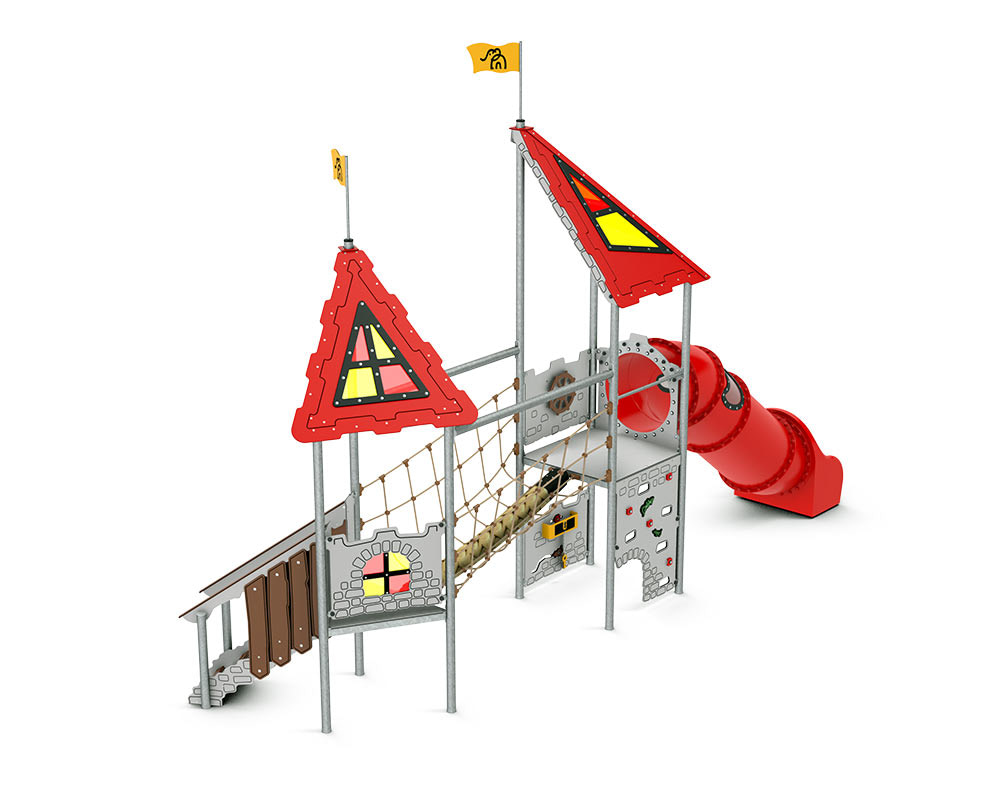 Dagonet ist die perfekte Wahl für Spielplätze, auf denen viele Altersgruppen miteinander spielen. Auf Bodenhöhe können Kinder die Schatztruhe entdecken – aber passt der Schlüssel auch? Und was steckt im verborgenen Schatz? Die Schatztruhe verfügt über mehrere bewegliche Teile und soll zu Rollenspielen anregen, während gleichzeitig Feinmotorik und Hand-Augen-Koordination der Kinder trainiert werden. Geschickte Kletterer können die senkrechte Kletterwand erklimmen, um auf die Plattformen zu gelangen. Oder sie nutzen einfach die Treppe, ehe sie sich auf die schwingende Hängebrücke wagen. Oben angekommen, geht es in einer rasanten Rutschpartie durch die Röhrenrutsche nach unten.