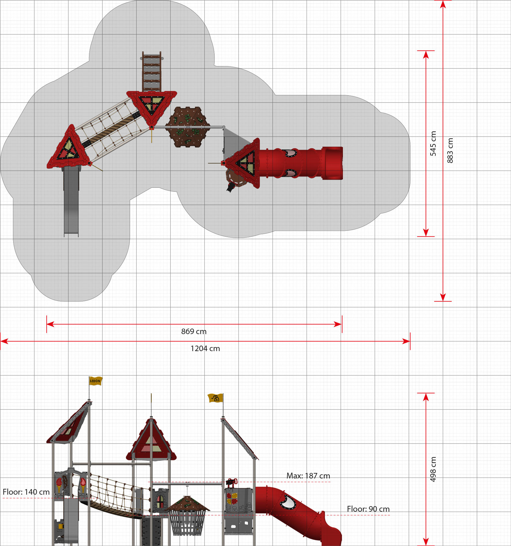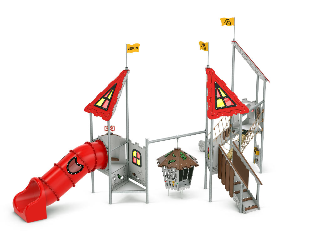 Die Spielanlage Elaine gehört zu den eher asymmetrischen und ungewöhnlichen Anlagen der Castle-Serie. Sie ist für unterschiedlich strukturierte Spielweisen gedacht, vor allem dank des Kerkers, der zwischen den beiden Türmen hängt. Der hängende Kerker ist bei Kindern äußerst beliebt zum Versteckspielen, aber auch um sich Geheimnisse zuzuflüstern oder Geschichten zu erzählen. Der erste Turm hat zwei Stufen, von denen die erste 40 cm über dem Boden liegt, sodass Kinder aller Altersstufen zur Röhrenrutsche gelangen können. Dank der Starthöhe von 90 cm und eingebauten Fenstern, die für Licht sorgen, können sich alle Altersgruppen am Spiel beteiligen. Außerdem besteht die Möglichkeit, die offene Rutsche zu nehmen, in der Schatztruhe nach Schätzen zu suchen, vom Ausguck aus die Gegend zu beobachten oder auf der schwingenden Hängebrücke sein Gleichgewicht zu testen.