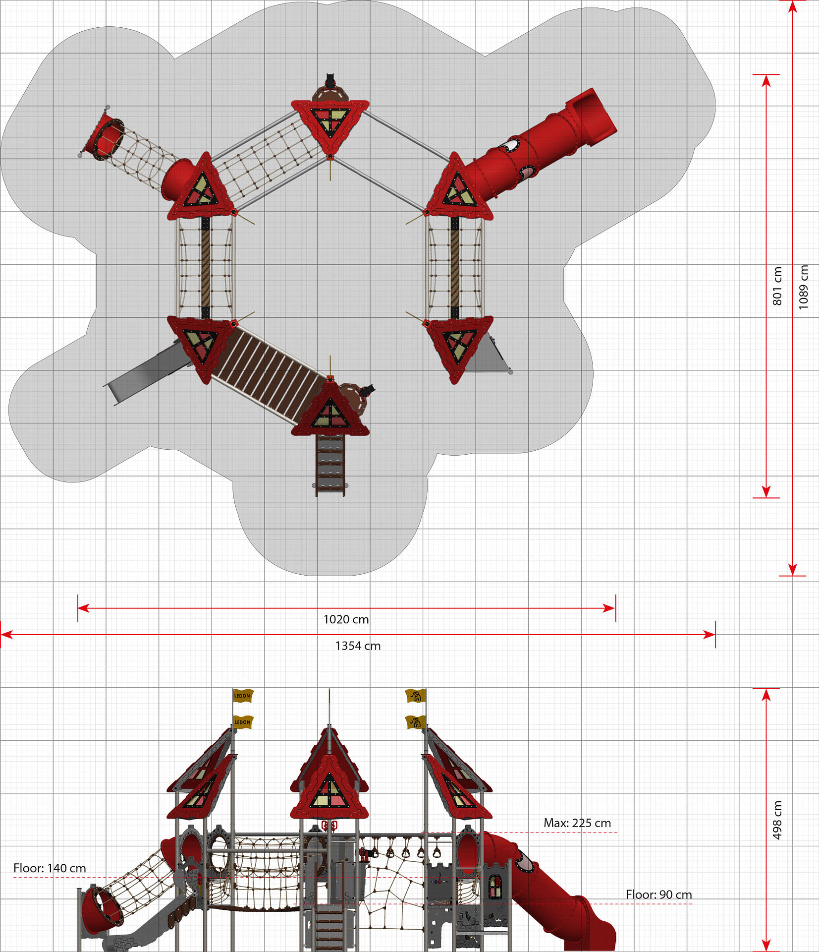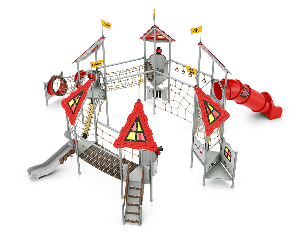 Arthur ist eine hexagonal angelegte Burg, die massig Spaß bietet und sich perfekt zum Fangenspielen oder beispielsweise für „Der Boden ist Lava“ eignet. Obendrein bietet Arthur viele spielerische Möglichkeiten zwischen den Türmen. Die Spielanlage hat alles, was das verspielte Herz begehrt – Spielwände, schwingende und schräge Hängebrücken, einen Ausguck samt beweglichem Teleskop, Hängegriffe und vieles mehr. Durch gelbe und rote transparente Scheiben im Dach entstehen auf dem Boden je nach Sonnenstand unterschiedliche Muster, die zum Spielen von „Himmel und Hölle“ animieren. Außerdem bieten sie die perfekte Vorlage für „Der Boden ist Lava“.