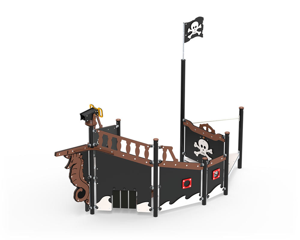 Mit dem flexiblen Piratenschiff können Sie Ihre Piratenwelt kontinuierlich erweitern, sodass sich die Investitionskosten für den Spielplatz über einen längeren Zeitraum verteilen. Sixtus ist ein großer Schiffsbug mit einem Anker zum Einholen. Außerdem können die Kinder das bewegliche Fernrohr neigen und drehen oder durch Gummiklappen in den geheimen Frachtraum kriechen. Die Kinder können sich auch ans Steuerrad stellen und das Schiff als Kapitän über die Sieben Weltmeere steuern. Beim anderen Teil des flexiblem Piratenschiffs handelt es sich um LP099 Merkurius.