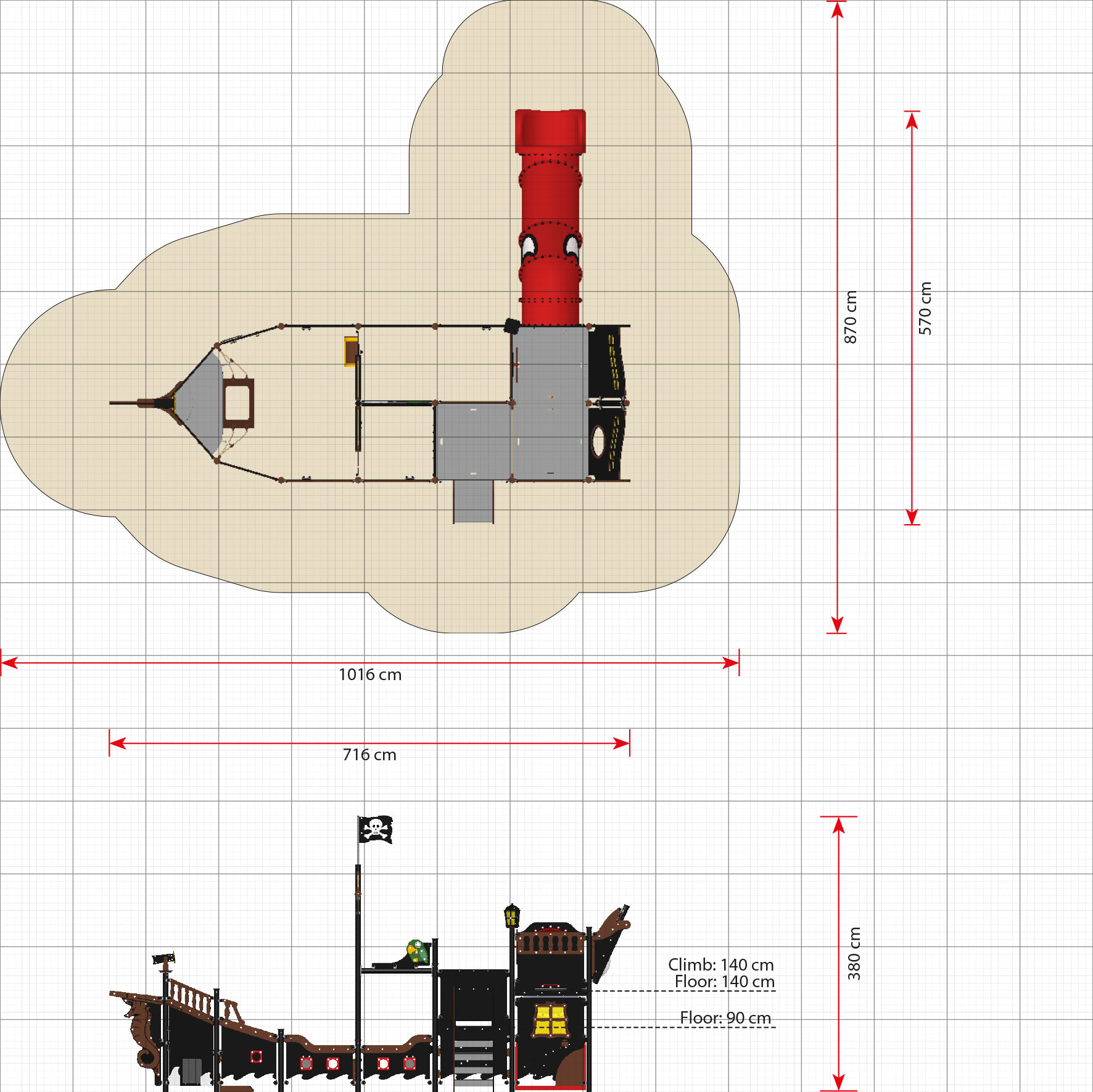 Unsere großen Piratenschiffe können in einer für die Oberflächenmontage geeigneten Version geliefert werden, da eine Erdmontage manchmal nicht möglich ist. Zum Beispiel auf asphaltierten Bereichen und Dachterrassen oder in Innenräumen usw. Für die Oberflächenmontage gelten weiterhin die Fallschutzboden-Regeln und in den meisten Fällen ist Gummi die naheliegende Lösung. Bitte beachten Sie, dass die Schiffe in den für eine Oberflächenmontage geeigneten Versionen kein großes Krabbelnetz am Heck haben.