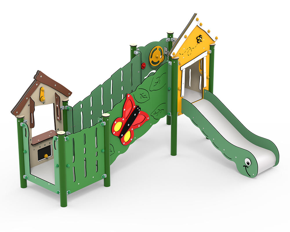 Der Übergang zwischen den beiden Türmen ist ein Erlebnis für sich. Auf der schrägen Brücke wohnt Olivias Schmetterling, dessen Flügel aus unkaputtbarem rotem und gelbem transparenten Polycarbonat bestehen. Durch ihn können Kinder die Welt in einem ganz neuen Licht betrachten oder die Lichtspiele beobachten und versuchen, sie „einzufangen“, wenn die Sonne im richtigen Winkel steht. Die schräge Brücke fordert und fördert die Motorik der meisten Kinder, die noch Schwierigkeiten damit haben, auf ihren kurzen Beinen das Gleichgewicht zu halten. Der zweite Turm eröffnet Zugang zum Fahrersitz, wo Schlüssel, Lenkrad und bewegliche Knöpfe selbst die verwegensten Rennfahrer auf den Prüfstand stellen, während diese ganz nebenbei ihre Feinmotorik trainieren. Hinzu kommt die Rutsche, die für endlose Spannung und Verzückung sorgt, während Grobmotorik und Gleichgewichtssinn trainiert werden.