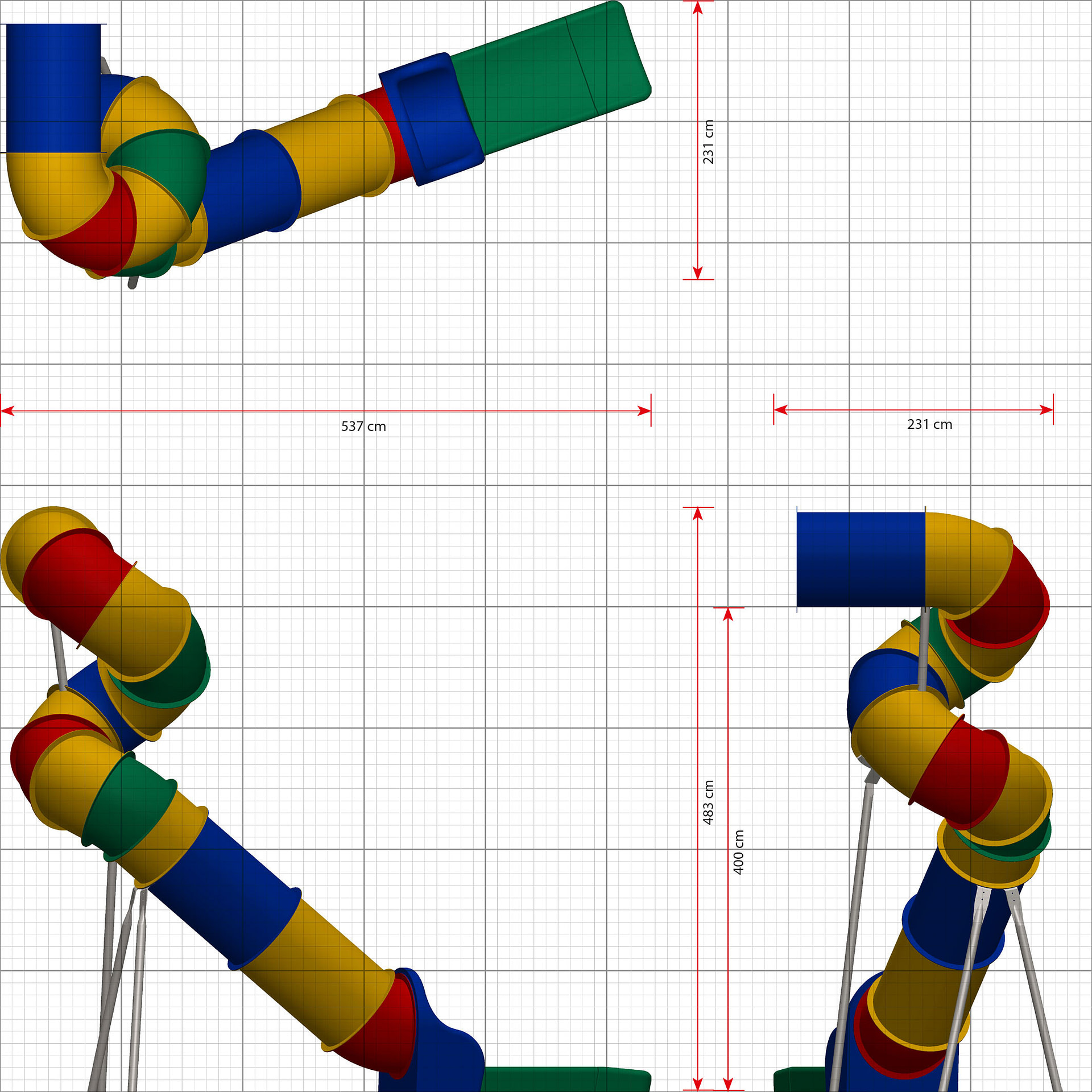 Unsere Röhrenrutschen sind in einer breiten Auswahl an Farben, Größen und Formen erhältlich. Dieses Modell kombiniert mehrere unserer verfügbaren Farben zu einem verspielten Aussehen.