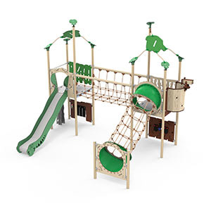 Dieser Wunsch konnte erfüllt werden dank der Spielgeräte aus unserer Themenwelt LEDON Explore. Diese Reihe ist besonders gut für junge und ältere Kinder geeignet, da sie eine große Auswahl an Spielgeräten mit vielen unterschiedlichen Spielaktivitäten umfasst. Die Gemeinde entschied sich für die Spielanlage Kepal. Die Anlage hat Spielwände in Bodennähe für die Kleinsten, während die älteren Kinder durch den Netztunnel nach oben klettern und vom Aussichtsposten aus die Umgebung überblicken können. Neben der Rutsche wurde eine Rampe angebracht, sodass auch kleinere Kinder Spaß beim Rutschen haben können.