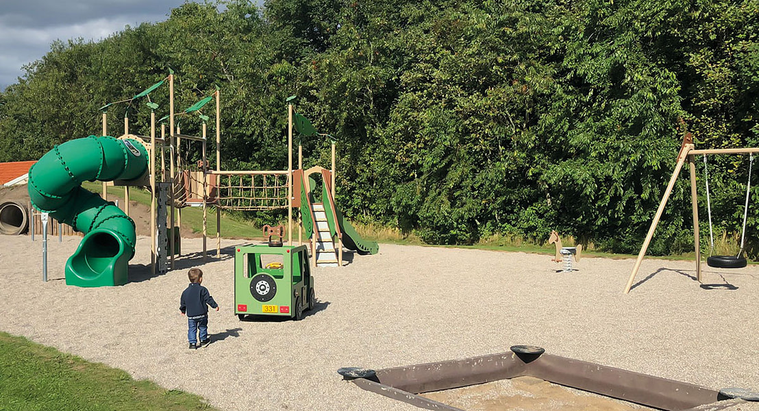 Die Kinder rasen durch die Röhrenrutsche und klettern wieselflink über die Hängebrücke auf dem Spielplatz der Wohnungsgenossenschaft Domea am Søvænget im dänischen Rødekro.