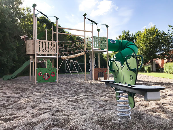 Dort wurde ein Spielplatz errichtet, auf dem sich die Spielanlage Zulu, der Geländewagen, ein großes modulares Schaukelgestell und die Butterfly-Wippe von LEDON befinden.