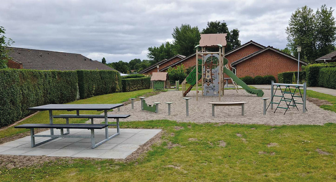 Die Lösung waren Spielgeräte an einem Ende der Grünfläche, mit einem Tisch und einer Bank in der Mitte, damit man sowohl den Spielplatz als auch die Ballspiele im Auge behalten kann. Die Spielgeräte stammen aus den Serien LEDON Explore und LEDON Basic. Sie ergeben einen Spielplatz, der Spielaktivitäten für alle bietet, und die natürlichen Farben der Serie fügen sich gut in die Umgebung ein. Den Kindern kommen klassische Spielgeräte wie Schaukeln, Spielhaus, Wippe und eine Spielanlage mit einem der Favoriten bei Kindern, nämlich der Rutsche, zugute. Zudem können sie auf einem unserer Hindernisparcours ihr Gleichgewicht trainieren, was für ältere Kinder eine Herausforderung ist, die Spaß macht.