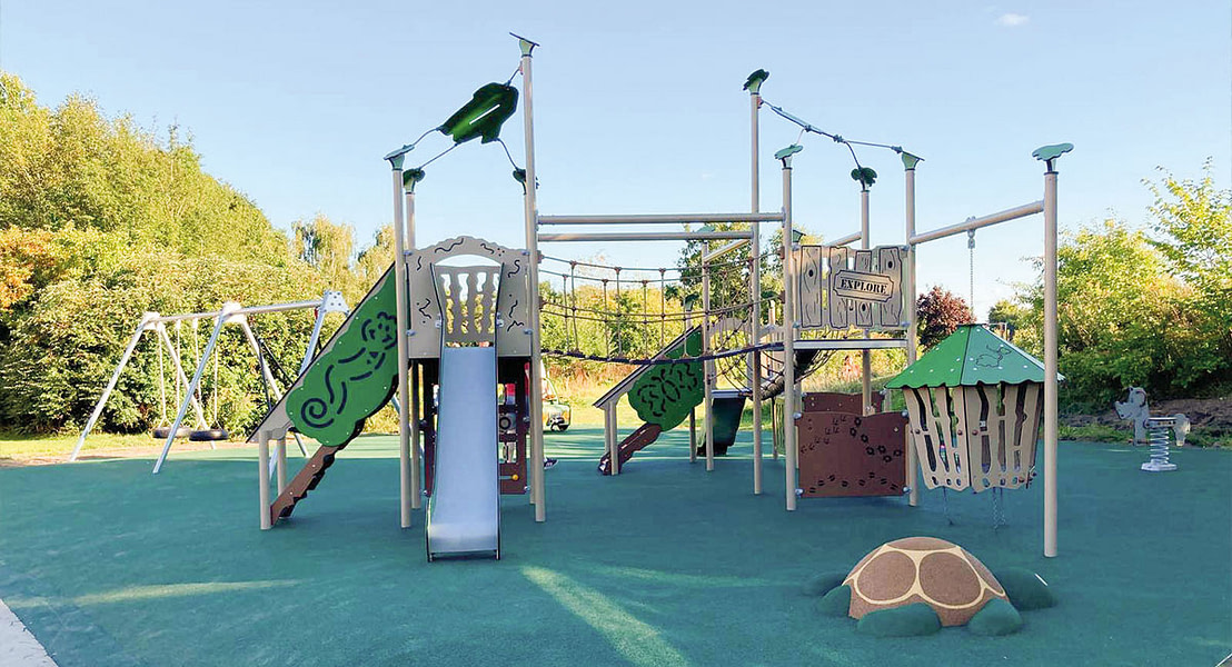 Alle unsere Spielgeräte benötigen kaum Instandhaltung, somit war die Gestaltung einfach und es wurde ein Spielplatz voller unterschiedlicher Aktivitäten geschaffen. Der Fallschutzboden war ebenfalls ein Teil der Lösung. Vor Ort gegossener Gummi ermöglicht es, Muster, Symbole oder Figuren in die Oberfläche einzubauen. Daher können die Kinder auf dem Spielplatz auch Himmel und Hölle spielen und sich an einer Schildkröte freuen, auf die sie hinaufklettern können.