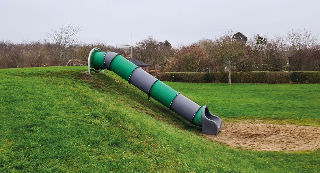 Die neue Röhrenrutsche misst von der Böschung bis zum Boden etwa fünfeinhalb Meter. Die Länge und das Gefälle bedeuteten, dass keine geschwindigkeitsreduzierenden Kurven oder ein Zwischenteil erforderlich waren, daher entschied sich die Wohnungsbaugesellschaft für ein gerades Design. Aus unseren fünf verschiedenen Farben wurden unsere Grau- und Grüntöne kombiniert, die am neutralsten sind. Durch den Wechsel zwischen den beiden Farben erhielt die Röhrenrutsche einen gestreiften Look und einen verspielteren Ausdruck, während sie gleichzeitig neutral wirkt.