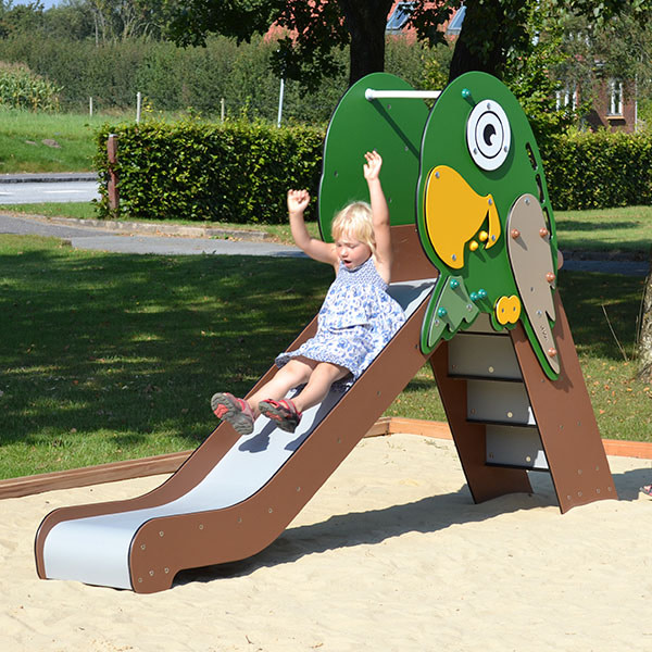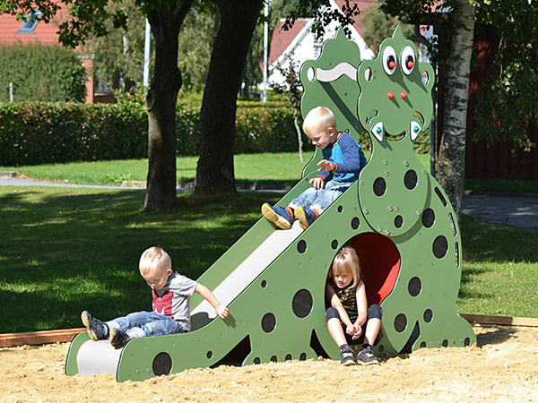 Viele unserer Rutschen wurden so entwickelt, dass sie zu verschiedenen Spielaktivitäten anregen. So findet sich beispielsweise bei den Modellen Braunbär und Dino unter der eigentlichen Rutsche noch eine „Höhle“. Kinder lieben Höhlen und Schlupfwinkel und bauen sie gern in ihr Spiel ein oder nutzen sie als Versteck, in dem sie Geheimnisse teilen können. Außerdem können die Kinder sich in die Höhlen zurückziehen, wenn sie eine Pause vom Spiel brauchen oder an einem ruhigen Ort miteinander reden möchten.